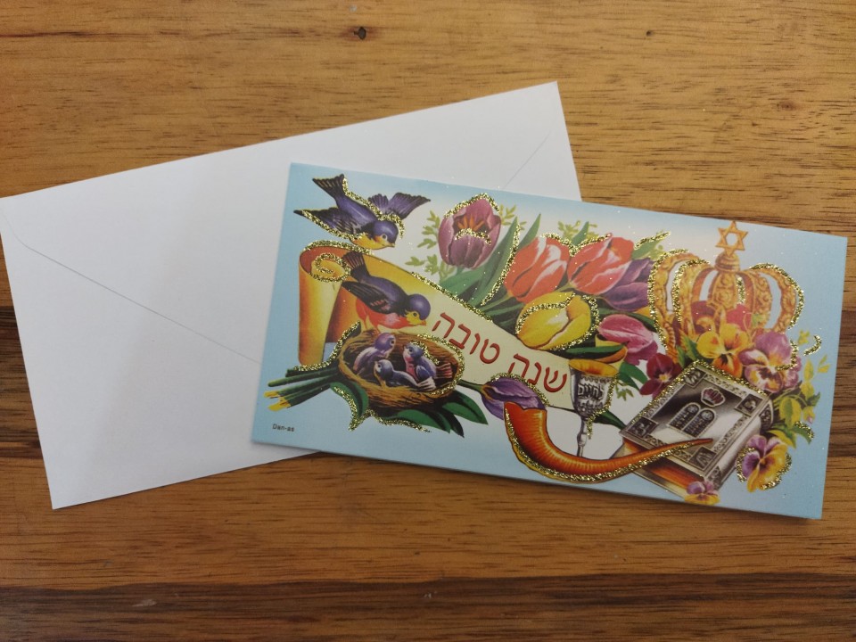 שנה טובה נוסטלגית של פעם עם נצנצים ומעטפה למשלוח.