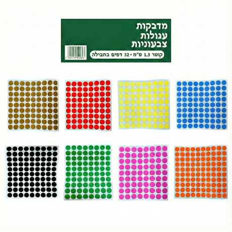 בכל דף יש 80 עיגולי מדבקה צבעוניים בקוטר 1.3 ס"מ.