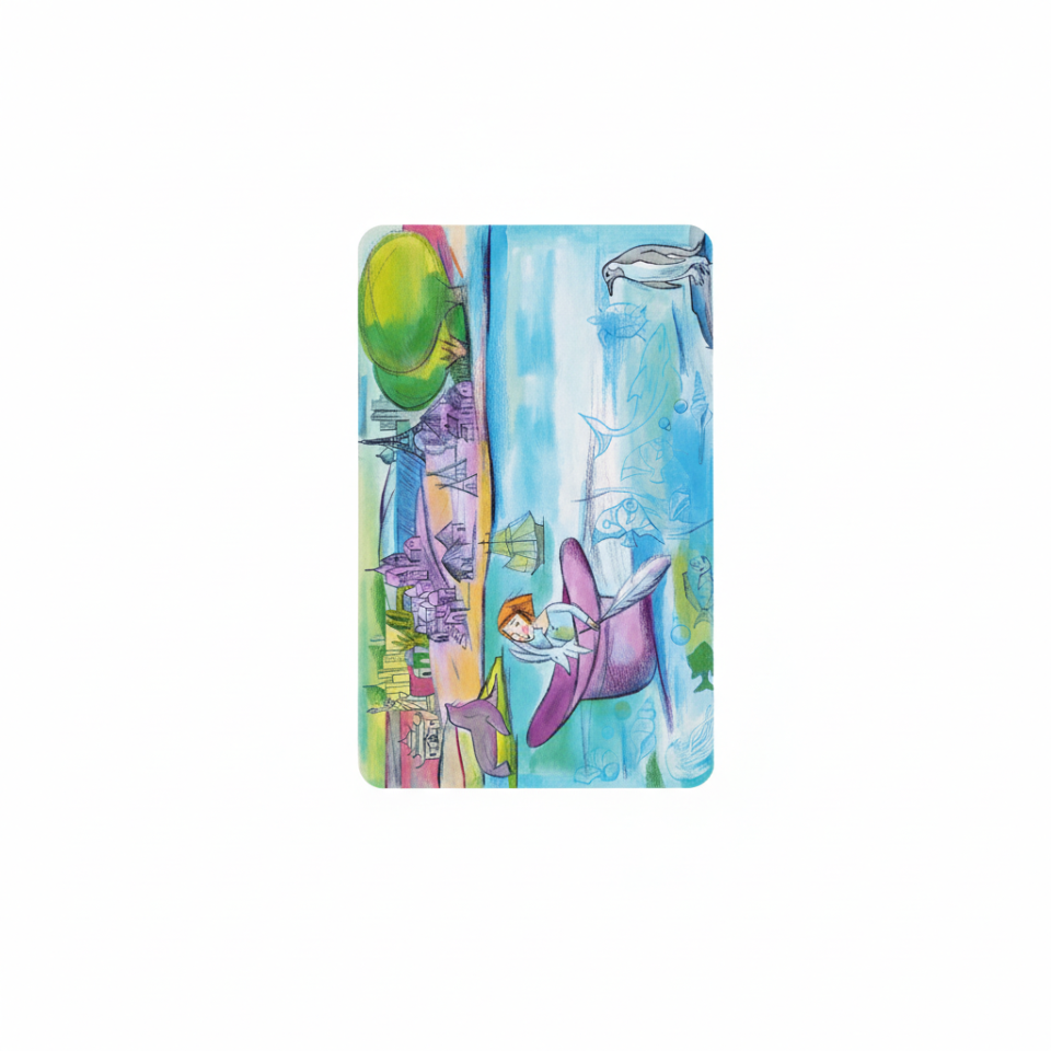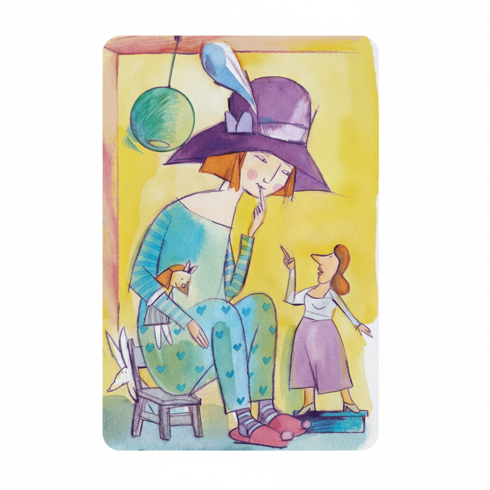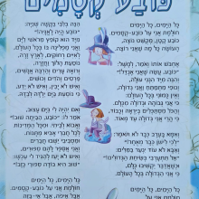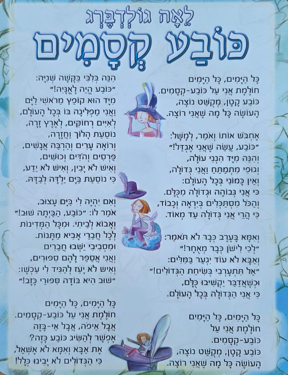 כרזה מעוצבת עם השיר כובע הקסמים ושבעה איורים מתוך הספר.